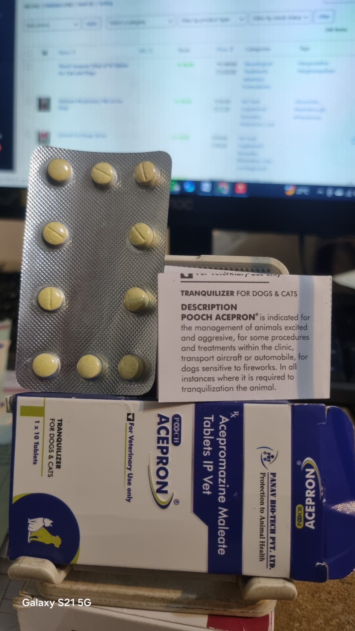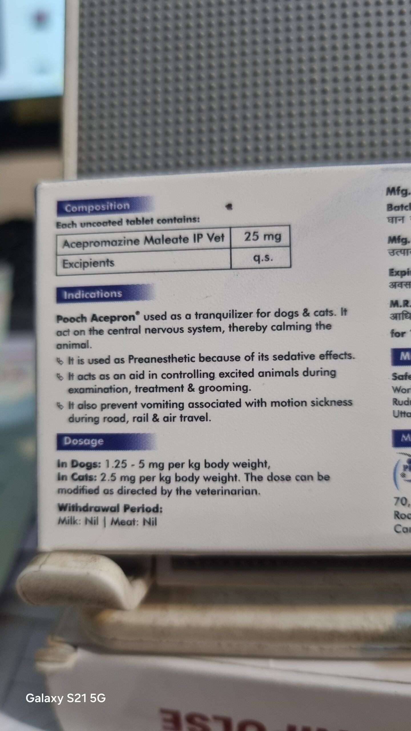 Pooch Acepron tablets contain acepromazine maleate which is a Tranquilizer / Sedative for cats and dogs. Acepromazine helps the pet to release anxiety and stay calm. It acts on the central nervous system, thereby calming the animal. It acts as an aid in controlling excited animals during medical examination, treatment & grooming. It also prevents vomiting associated with motion sickness during road, rail & air travel.