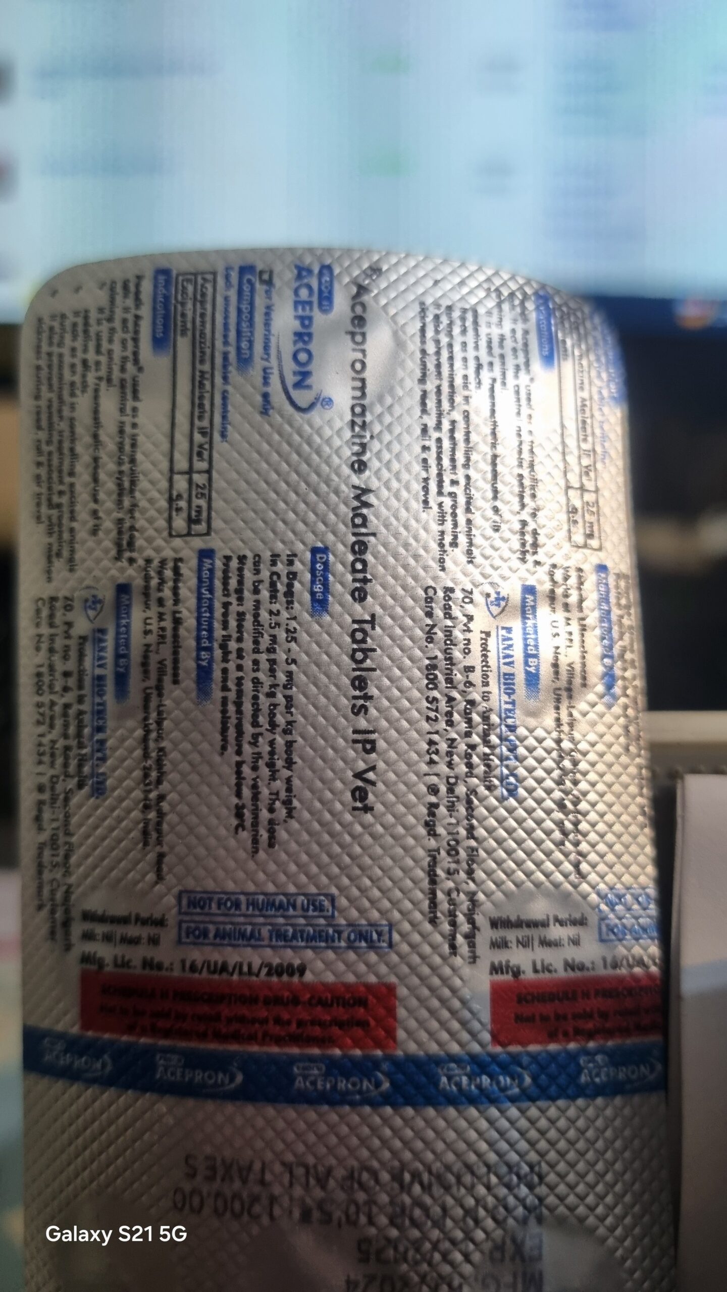 Each uncoated tablet contains Acepromazine maleate IP Vet 25 mg