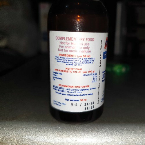 FOR USE: DOGS and CATS: 1 ml per 5 kg of weight every 12 hours. It can be administered in food, water, on a treat, or directly in the mouth.